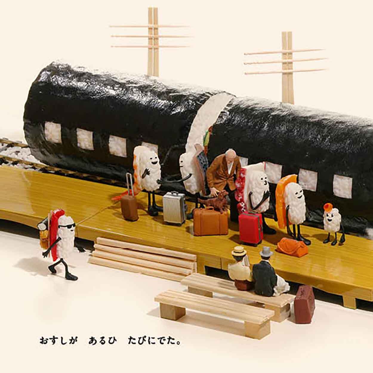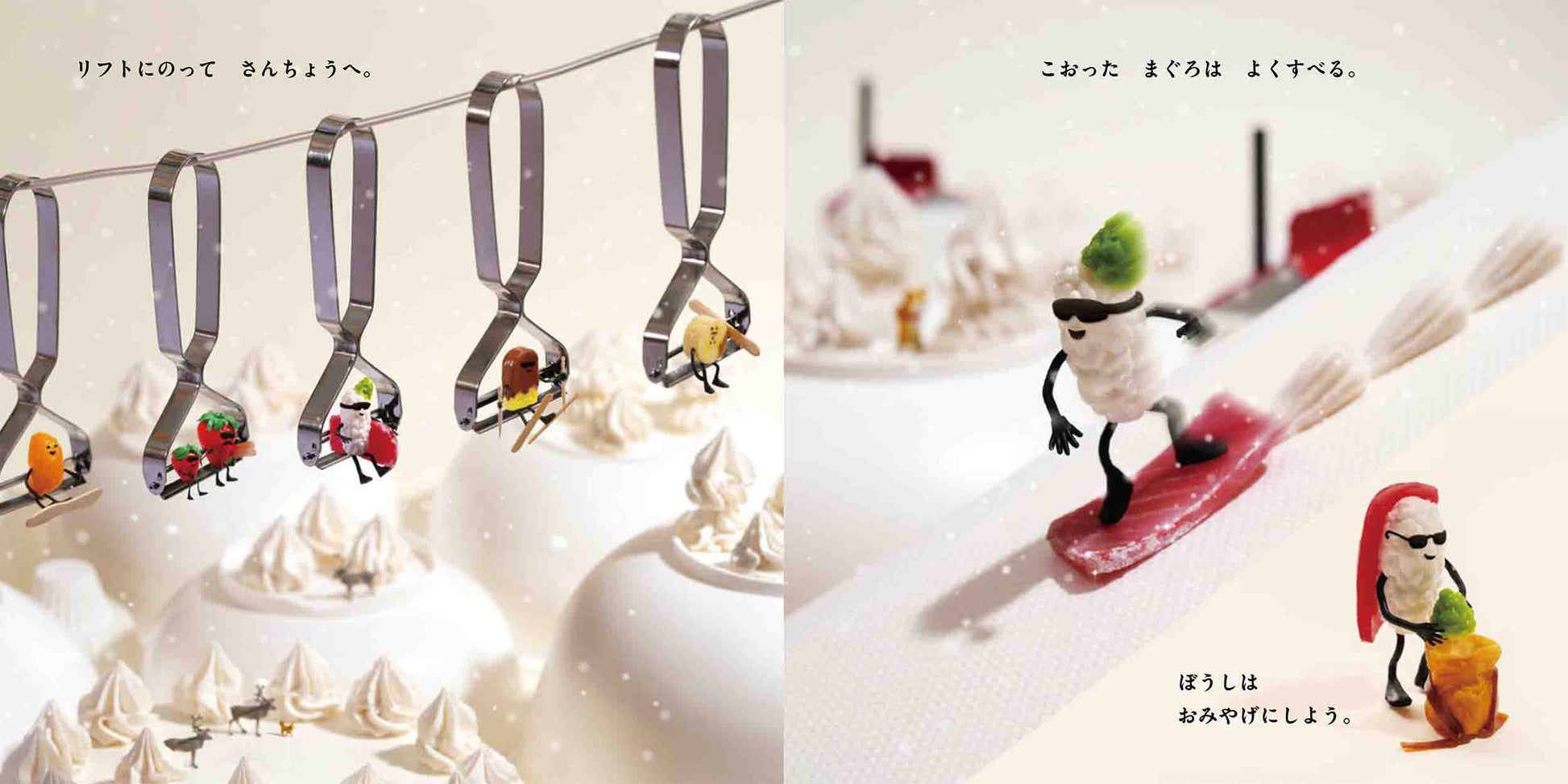 身近なものを見立ててつくられた砂浜や雪山、砂漠の遺跡を、マグロのおすしが大冒険。
